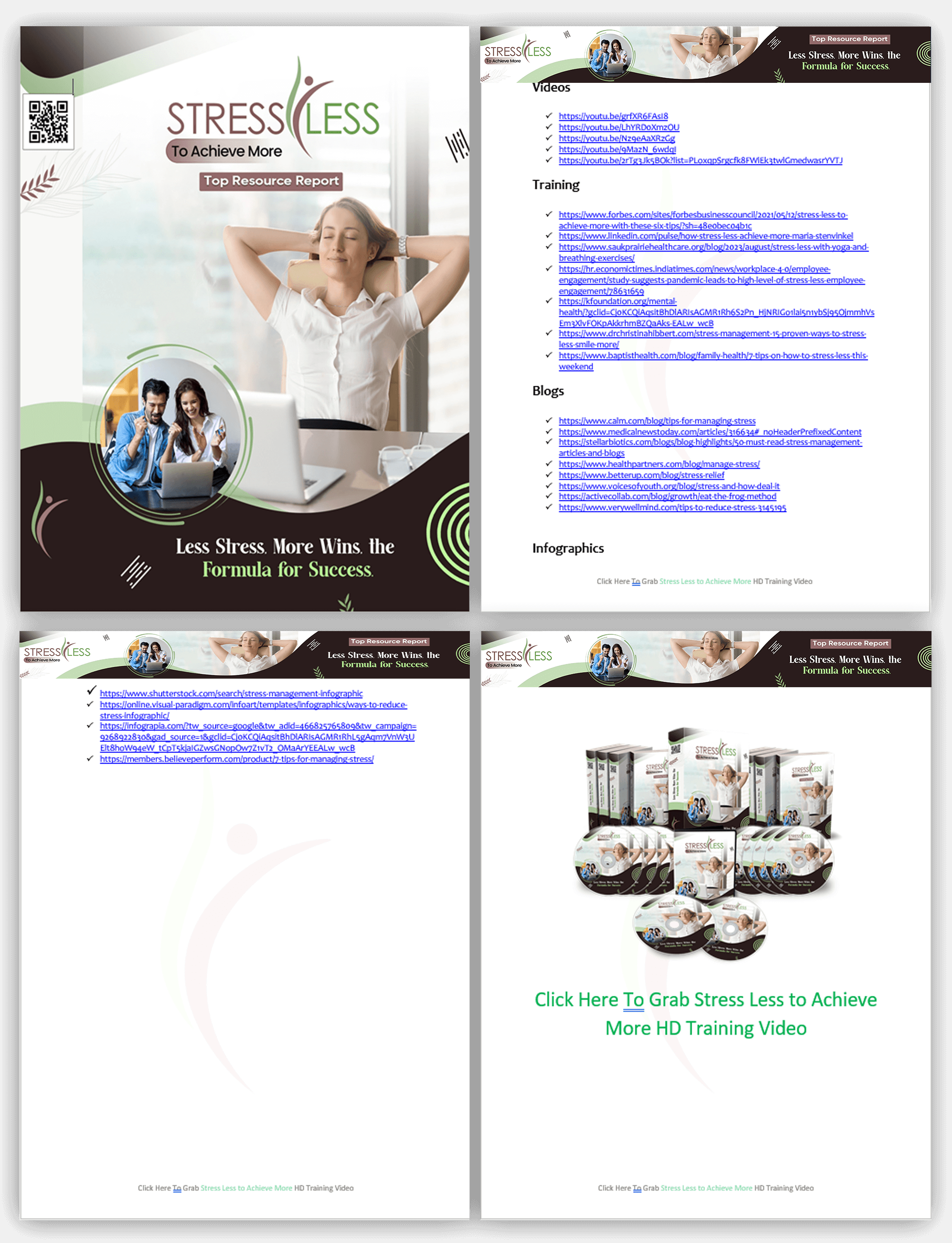 This is a comprehensive Research Report on 'Stress Less to Achieve More'resources, including Videos, Tools, Training courses, Forums, Infographics, and Facts.